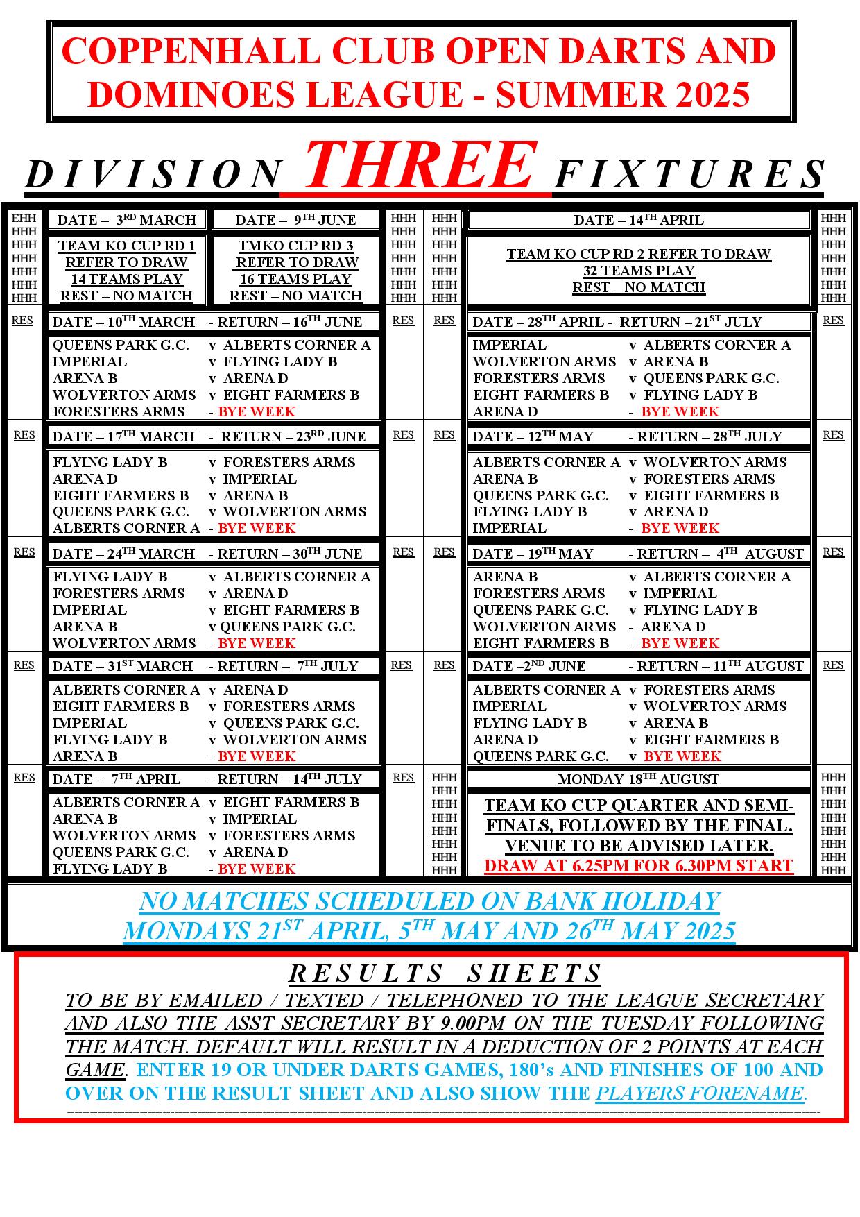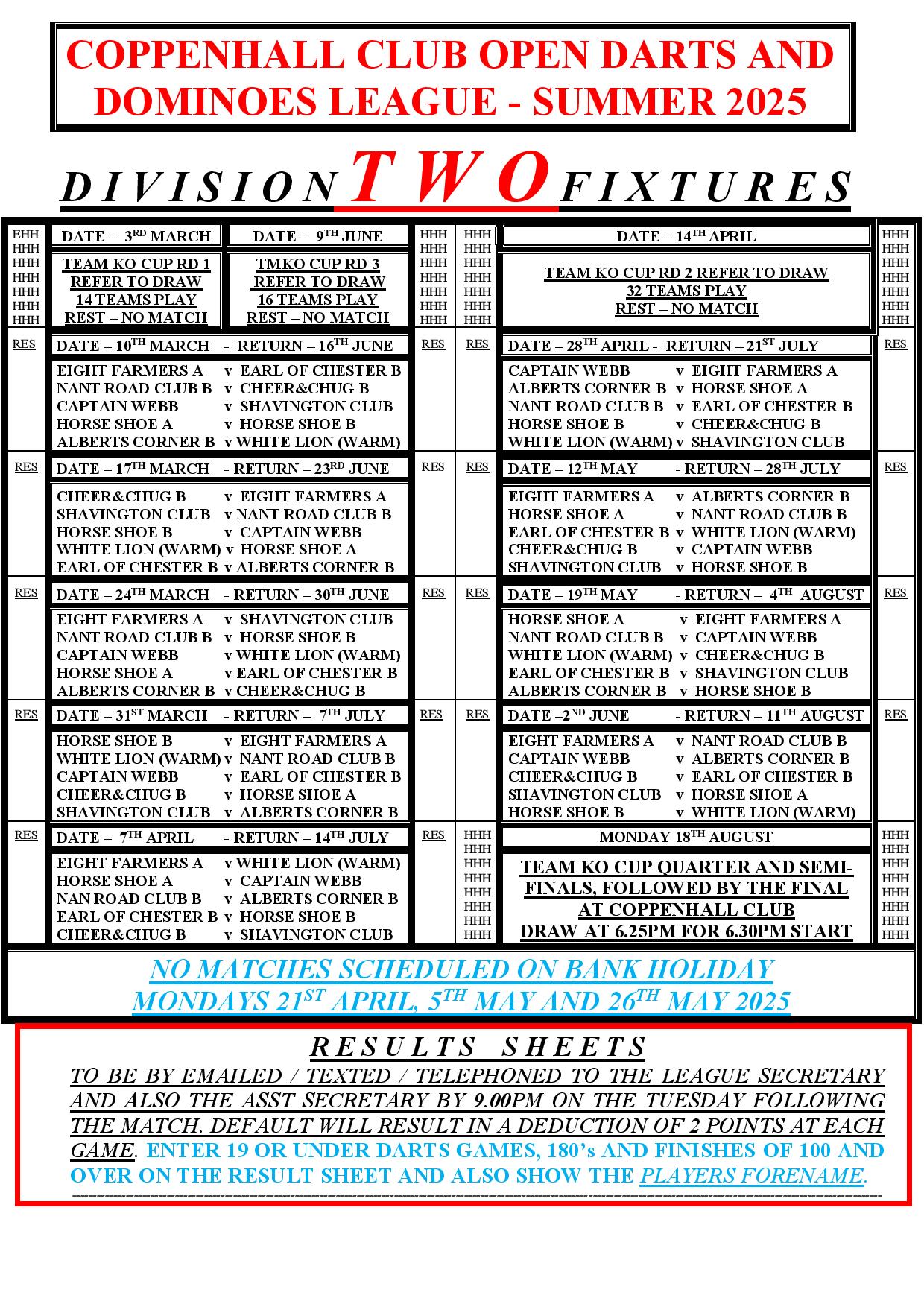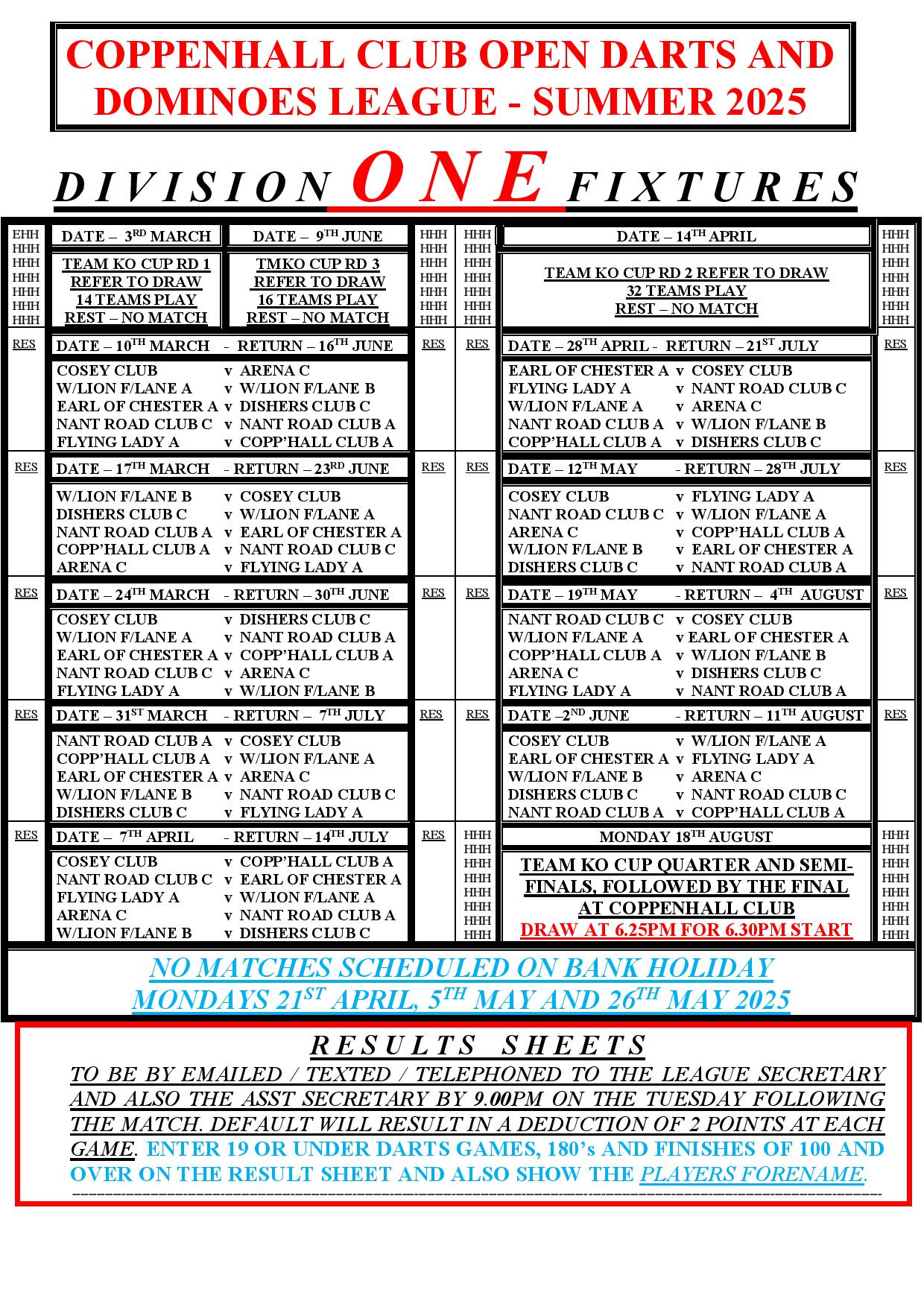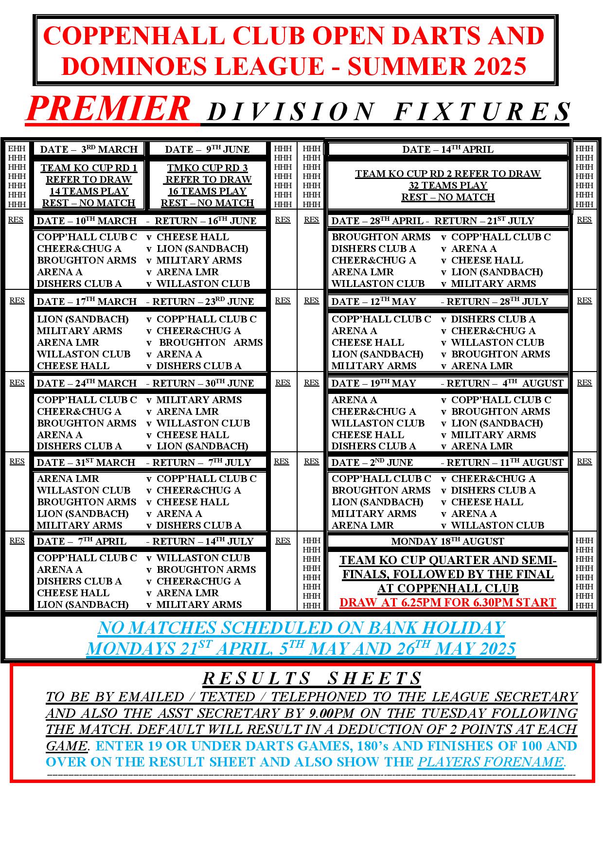 PREMIER LEAGUE DIVISION 1 DIVISION 2 DIVISION 3 Post navigation TEAM KNOCKOUT ROUND 2 FIXTURES 14/4/25 Team KO Round 3 Fixtures